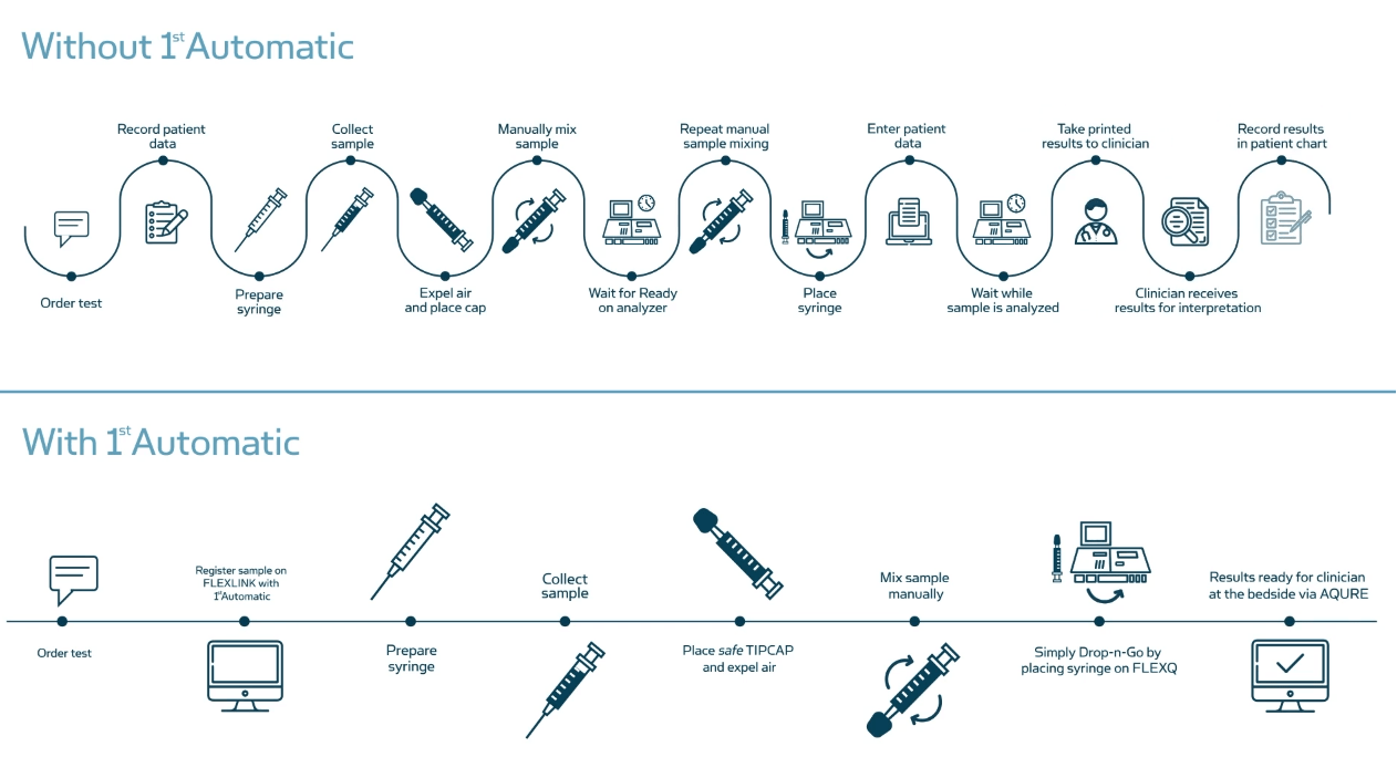Kombinieren Sie Ihren ABL800 FLEX und safePICO Probennehmer mit dem FLEXLINK-System von AQURE um das 1st Automatic System zu nutzen. Mit dieser vernetzten Lösung werden Patienten-, Bediener- und Proben-IDs bettseitig erfasst und die Daten von FLEXLINK miteinander verknüpft. Ein Beispiel, wie dies Ihren Arbeitsablauf beschleunigen könnte, ist unten aufgeführt.